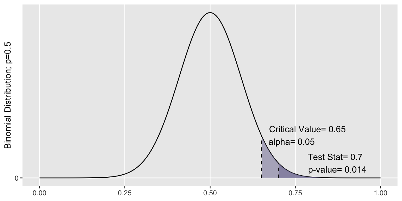 In order to reject the null in favor of the alternative, we’re looking for sufficient evidence from our test statistic. Consider this: if the test statistic did indeed come from a distribution where the true parameter is \(p=0.5\), how likely is it that we’d get \(\hat{p}\) of \(0.70\) or greater?