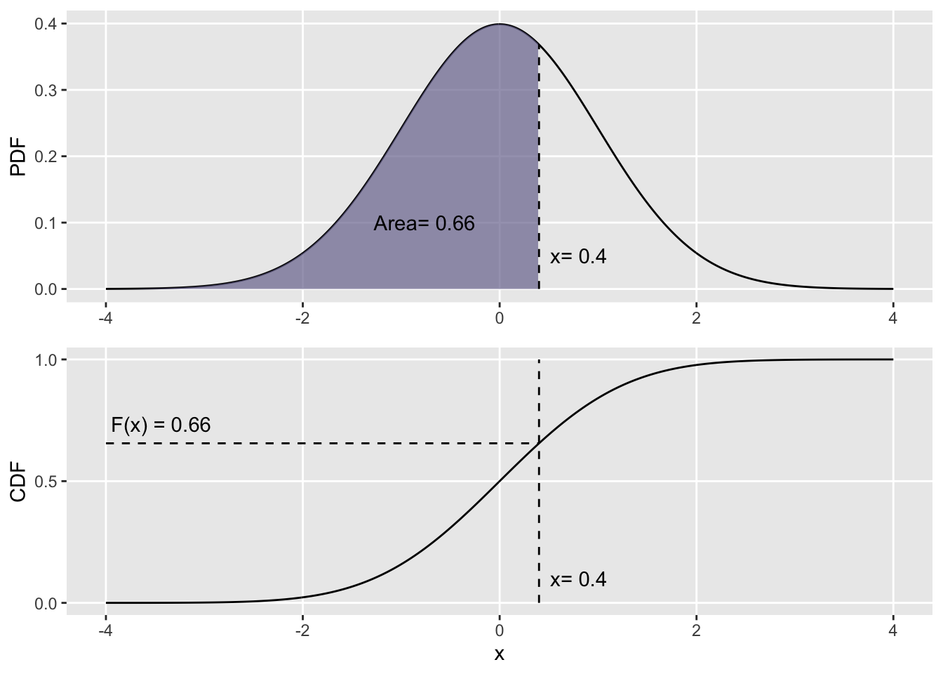 Cumulative Distribution Function (CDF). \(F_x(x)\) describes the probability of seeing a value less than or equal to \(x\), \(F_x(x) = Pr(X\leq x)\). Mathematically, it is the integral of the pdf \(f_x(x)\) for each point \(x\): \(F_x(x) = \int_{-\infty}^{x}f_t(t)dt\). To visualize that relationship: